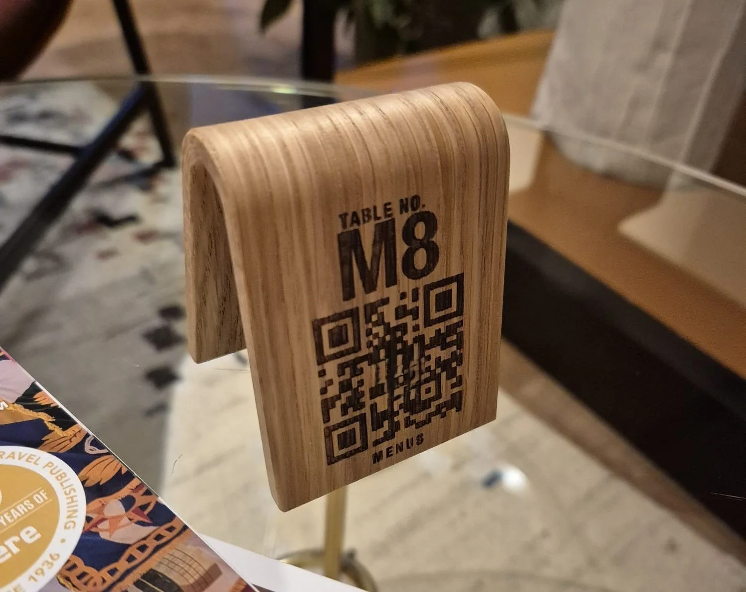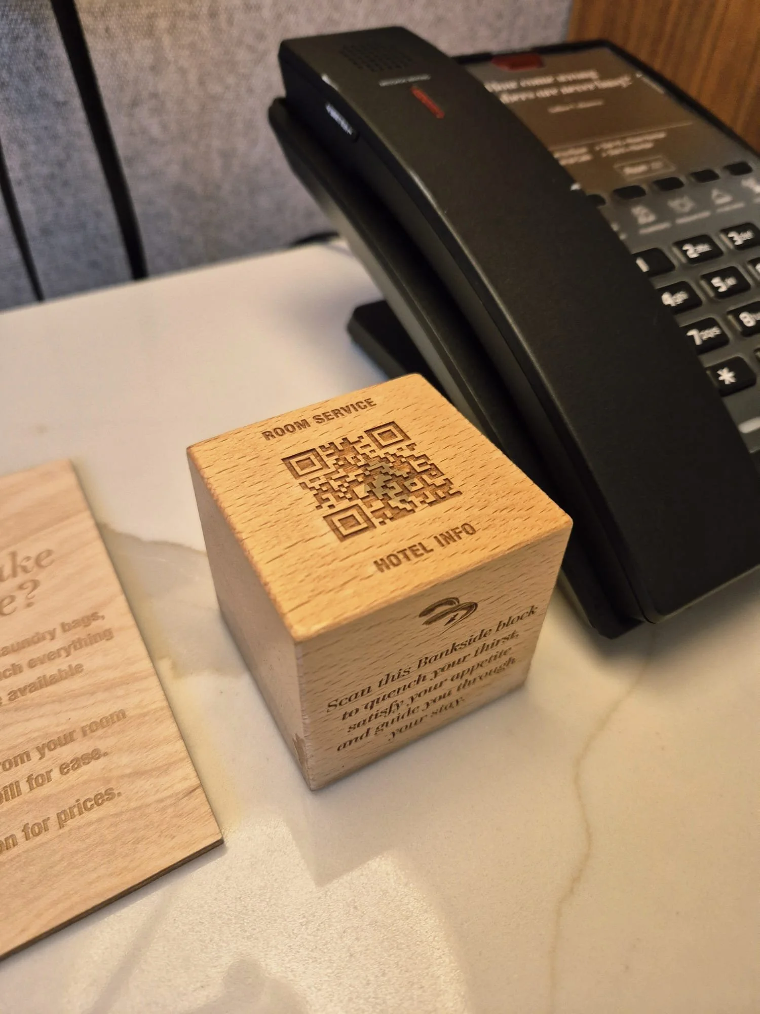 The hotel actively promotes the system through stylish QR code cubes in guest bedrooms and wooden QR stands on tables in the Mezzanine.